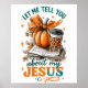 Design paisible et coloré avec une scène automne / automne avec un livre ouvert, citrouille et café. Le texte inspirant et coloré dit : "Laissez-moi vous parler de mon Jésus". Ce design est disponible sur une grande variété de produits.
