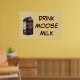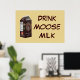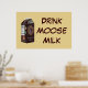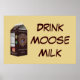 Une brique de lait de la ferme laitière Matanuska Moose Milk de renommée mondiale et entièrement mythique à Willow Alaska; pas trop loin d'Anchorage. Le slogan "Buvez du lait d'orignal" apparaît également. L'image du logo est ornée d'une milkmaid qui traite la Matilda, la première orignale laitière de la ferme. Croyez-le ou non, il y a des laiteries d'orignaux ; un petit nombre en Russie et un en Suède. Le lait d'orignal est cultivé commercialement en Russie. Un veau d'orignal né à la ferme est retiré de sa mère dans les 2-3 heures suivant la naissance et est élevé par des gens. Il est d'abord nourri en bouteille avec un substitut de lait, puis nourri à partir d'un seau. Les animaux s'impriment et deviennent attachés aux humains. Le lait est riche en matières grasses (10%) et solides (21,5%), selon les données recueillies sur l'orignal russe ; les recherches sur le lait d'orignal américain sont dans un état moins avancé qu'en Russie, mais semblent indiquer que les concentrations d'orignaux américains sont encore plus élevées dans leur lait. On dit que le lait d'orignal est un peu salé et amer, avec un soupçon d'aiguilles de pin ou d'épinette. Le lait d'orignal est cultivé commercialement en Russie. Un veau d'orignal né à la ferme est retiré de sa mère dans les 2-3 heures suivant la naissance et est élevé par des gens. Il est d'abord nourri en bouteille avec un substitut de lait, puis nourri à partir d'un seau. Les animaux s'impriment et deviennent attachés aux humains. Comme pour le bétail laitier, les veaux sont retirés de leur mère après un court laps de temps.Les Russes disent que l'orignal reconnait bientôt les sirènes de lait comme leur substitut comme ses veaux de remplacement. À ce stade, ils sont rejetés dans la forêt, mais ils visitent la ferme tous les jours pour être traités pendant la période de lactation (généralement, jusqu'à septembre ou octobre). En hiver, les animaux se promènent librement dans la forêt environnante. Mais en général, ils ne s'éloignent pas trop, mais passent une grande partie de leur temps dans les boisés voisins où les arbres sont coupés, se nourrissant des sous-produits de l'exploitation du bois. Et ils connaissent la ferme comme l'endroit pour une ration quotidienne de farine d'avoine, et comme un endroit sûr pour donner naissance à leurs jeunes. Un sanitorium russe sert du lait d'orignal aux résidents dans la conviction qu'il les aide à se remettre de la maladie ou à gérer les maladies chroniques plus efficacement. Des chercheurs russes ont recommandé que le lait d'orignal soit utilisé pour prévenir les maladies gastro-entérologiques chez les enfants. La ferme Elk (Oie sont appelés Elk in Europe) House (Älgens Hus) à Bjurholm, en Suède, est considéré comme le seul producteur mondial de fromage d'orignal. Le fromage se vend environ 500 dollars la livre. Le restaurant de l'Algens Hus sert des plats à base de fromage d'orignal. Fromage simple avec du pain ou des biscuits, ou mieux encore, mousse d'orignal congelé. Mieux servi avec des framboises.