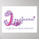 Jolie affiche de nom avec monogramme L, parfaite pour la chambre ou la salle de jeux d'une fille dans des tons de rose et de violet. Personnalisez avec votre nom commençant par L, et la signification du nom pour un effet vraiment personnalisé dans la chambre ou la nurserie de votre enfant, cet exemple est pour le nom Lajuana Un cadeau. Gracieux, diligent et généreux. Jolie impression idéale pour un nouveau-né, un cadeau de baptême ou de shower bébé ou pour la chambre d'un enfant. © Dessin et conception graphique de monogramme L unique avec cœurs et fleurs par Sarah Trett. www.sarahtrett.com pour www.mylittleeden.com