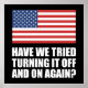 Avons-Nous Essayé De L'Éteindre Encore Et Encore ? Cet amusant accessoire d'humour politique américain est parfait pour tous ceux qui suivent l'actualité et les événements, et s'inquiète de la polarisation de la politique américaine divisée. Un grand cadeau pour quiconque apprécie la satire politique et les citations sarcastiques. L'Amérique ne semble pas fonctionner en ce moment, peut-être devons-nous la traiter comme un problème informatique et l'éteindre et la remettre en marche ? Caractéristiques texte typographique et un drapeau américain.