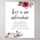 This Love Is An Adventure liste d'idées signe mariage, avec ses fleurs d'aquarelle bordeaux et le mélange de calligraphie et de polices simples, est une torsion moderne sur le livre d'invités mariages. Demandez à vos invités d'écrire leur idée préférée pour un endroit où aller ou quelque chose à faire dans votre vie de couple marié.