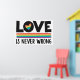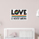 Affiche du mois de la fierté LGBTQ avec la légende "L'amour n'a jamais tort" en noir toutes les polices casquettes décorées d'un petit coeur arc-en-ciel et d'une bande colorée sur un arrière - plan blanc.