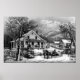 Reproduction du Currier & Ives imprimé "The Old Farm House", imprimé vers 1872. Scène hivernale d'une maison de campagne avec un couple dans un traîneau tiré à cheval au premier plan.