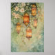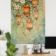 It features several intricate, hanging lanterns glowing warmly against a soft, green, botanical backdrop.