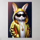 Cool mignon avec lapin lapin blanc humanoïde portant un sweat - shirt à capuche jaune doré, une chaîne de cou et des lunettes de soleil foncées.
