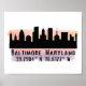 Caractéristiques de l'impression murale Baltimore Maryland ville silhouette avec éclaboussure d'aquarelle et coordonnées de la carte de latitude et longitude