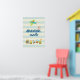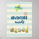 Une affiche mignonne avec des bébés animaux qui dit L'aventure vous attend. Conçue avec une illustration d'art de nurserie à thème enfantin représentant un petit chien voyageant dans un avion et un train jouet rempli d'animaux fantaisistes. Sur un fond rayé crème et bleu.