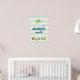 Une affiche mignonne avec des bébés animaux qui dit L'aventure vous attend. Conçue avec une illustration d'art de nurserie à thème enfantin représentant un petit chien voyageant dans un avion et un train jouet rempli d'animaux fantaisistes. Sur un fond rayé crème et bleu.