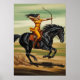 Peinture à l'huile Art Déco qui représente une archer montée sans peur dans une tunique safran vibrante à pleine galop, sa forme géométrique stylisée définie par un éclairage dramatique de chiaroscuro alors qu'elle perd une flèche d'un cheval noir puissant et brillant.