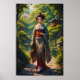 Maiden of the Green Garden - (Midori no Sono no Otome) - Cette oeuvre représente une femme solitaire en tenue japonaise traditionnelle, un kimono, marchant le long d'un chemin sinueux en pierre dans un jardin luxuriant. Sa robe est composée d'un mélange de vert tendre, de gris muet et de rouge profond, avec des motifs floraux subtils. Elle porte un petit panier tressé rempli de ce qui semble être des fleurs rouges.
