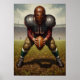 Une puissante peinture à l'huile Art Déco représentant un quarterback féminin monumental en armure de cuir vintage encombrante, sa forme géométrique stylisée définie par l'éclairage moody chiaroscuro alors qu'elle se prépare à lancer le ballon.