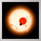 Concept artistique du système Kepler-16, montrant l'étoile binaire orbitée par Kepler-16b. Kepler-16 orbite un K-nain qui tourne lentement et qui est très actif avec de nombreuses taches d'étoiles. Son autre étoile parente est une petite naine rouge. Le plan orbital planétaire est aligné à moins d'un demi degré du plan orbital binaire stellaire.