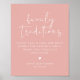 Ce baby shower de tradition familiale signe modèle dispose d'une police manuscrite pointue et d'un design moderne minimaliste avec une combinaison vibrante de couleurs rose pastel et blanc. Modifiez le libellé *le plus* pour répondre à vos besoins. La combinaison simple de couleurs noir et blanc en fait l'ajout parfait à votre événement de printemps, de jardin et de baby shower fille.