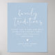 Ce baby shower de tradition familiale signe modèle dispose d'une police manuscrite pointue et d'un design moderne minimaliste avec une combinaison vibrante de couleurs pastel bleu et blanc. Modifiez le libellé *le plus* pour répondre à vos besoins. La combinaison simple de couleurs noir et blanc en fait l'ajout parfait à votre événement de printemps, jardin et baby shower garçon.