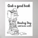 Simple prise mono et bon livre enfants lecture poster de jour. Personnalisé avec votre propre date d'événement de jour de lecture. Une fille d'origine assise sur une pile de livres lisant des contes de fées qui peuvent être colorés par les étudiants. Copyright Art et design de Sarah Trett pour www.mylittleeden.com