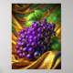 "Sur la luxueuse nappe dorée, une grappe de raisins succulents et moelleux s'épanouit dans la lumière douce. Leurs riches teintes de violet profond et de vert vif créent un contraste saisissant par rapport au tissu chatoyant. La peau lisse des raisins reflète une finesse, invitant à tendre la main et à savourer leur saveur sucrée et juteuse. L'élégance de la scène est rehaussée par le jeu subtil de la lumière et de l'ombre, faisant apparaître les raisins comme des bijoux sur un décor somptueux."
