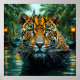 Vue saisissante et rapprochée d'un grand léopard au visage vivement marqué, combinant des éléments à la fois du tigre et du jaguar. Sa fourrure orange et noire vibrante contraste avec le feuillage vert luxuriant qui l'entoure. Le chat a des yeux verts perçants qui attirent l'attention, sur fond d'une voie d'eau calme et scintillante. Un éclairage doux et atmosphérique illumine des lanternes et des plantes tropicales, créant une ambiance enchanteresse et mystérieuse. Globalement, la composition dégage un sentiment de majesté et d'intrigue, mêlant la faune à un environnement serein et pittoresque.