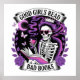 Un design coloré et dynamique présente un squelette féminin lisant un livre tout en sirotant un cocktail torride. Elle est entourée de fleurs violettes et de papillons, ajoutant à l'esthétique animée. Le texte gras et coloré dit : "Les bonnes filles lisent de mauvais livres." Ce design unique est disponible sur une large gamme de produits.