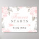 Élégant panneau de flèche de cérémonie de mariage "Les débuts de l'éternité de cette façon" avec des couleurs rose pâle et gris ardoise encadrées par une bordure de roses roses douces avec des feuilles vertes / grises. Les fleurs ont une belle apparence peinte à l'aquarelle. Parfait pour un événement de printemps ou d'été.
