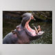 Sur l'image, un gros plan d'un hippopotame montre sa présence imposante, avec de larges mâchoires ouvertes révélant d'énormes dents. Cette photo capture la puissance brute et la beauté primale de ce mammifère africain emblématique.