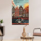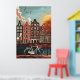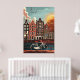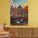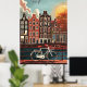 Illustration d'Amsterdam, la capitale de la Pays-Bas, on y trouve de charmantes maisons colorées le long d'un canal, une bicyclette blanche au premier plan, et des arbres d'automne sous un ciel bleu avec des oiseaux volant.