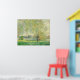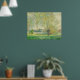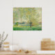 Cette belle peinture de Claude Monet présente une scène vaguement peinte avec une palette de couleurs est presque complètement dominée par les tons cool du printemps, de la sauge, du céleri, du vert varech, de l'acier et du bleu de mer. Des daubes jaunes dorés dans le bas à droite suggèrent des fleurs, et des feuilles sur les arbres sont créés avec des traits et des dabs vers le haut et minces le long de branches fines. Les arbres s'élèvent en hauteur dans un ciel rempli de balais de beige, de rose vif et de vert printanier superposés à un bleu pâle. La rivière est gris lavande, et les bâtiments bas et serrés sont peints d'un mélange d'ocre, de pêche et de bleu denim. Mes images d'art sont tirées de galeries publiques et optimisées à haute résolution afin de fournir une impression de qualité.
