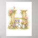Charming Letter H monogram poster featuring ornate gold filigree with a fluffy kitten with bright blue eyes beside a vintage watering can. A baby bird nestles in its nest with Easter eggs while pink tulips, yellow daisies, and a yellow butterfly complete this garden scene. Gallery-quality Giclee print on durable 185gsm microporous resin-coated paper with semi-gloss finish and pigment-based inks for vibrant, fade-resistant color.
