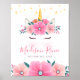 Affiche licorne au visage floral étoilé aquarelle bébé. Une licorne fille mignonne décoration de chambre bébé avec un doux visage de licorne aquarelle, des fleurs et des étoiles dorées.