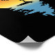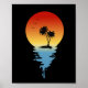 Illustration numérique saisissante d'une île tropicale aux cocotiers en silhouette face à un coucher de soleil. Le design présente un riche dégradé de teintes chaudes qui se transforment en bleus cool, créant une réflexion fascinante qui semble glisser vers le bas, mêlant surréalisme et esthétique minimaliste. Les oiseaux qui s'envolent dans le ciel rehaussent l'atmosphère paisible mais artistique, ce qui en fait une pièce parfaite pour la décoration moderne, l'habillement ou les impressions numériques. La présence de la mer qui entoure l'île ajoute profondeur et atmosphère tropicale sereine.