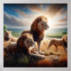 Un groupe de lions puissants se dresse fièrement sur un terrain couvert d'herbe sous le soleil d'or, surveillant leur territoire avec des yeux attentifs.