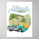 Le logo Miami Sunset d'une voiture classique de style vintage à la tombée de la nuit.