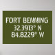 Coordonnées de la carte de latitude et de longitude pour Fort Benning - Columbus, Georgia Police blanche de style sercil sur l'arrière - plan vert de l'Armée.