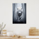 Un loup blanc majestueux aux yeux bleus percevants se dirige vers le spectateur dans une forêt dense et brumeuse. La fourrure du loup est blanche et immaculée, contrastant fortement avec les arbres sombres et ombragés et l'atmosphère brumeuse. Le regard du loup est intense et ciblé, et il exprime un sentiment de puissance et de détermination. Un cadeau parfait pour les amateurs de loups