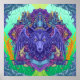 Un loup majestueux et ailé occupe le centre de l'image, ses yeux percés et son expression déterminée véhiculant un sentiment de puissance et de noblesse. Autour du loup sont des motifs complexes et ornés, dont des anges, des crânes, des flammes et une bannière avec un symbole.