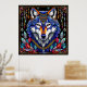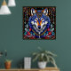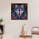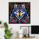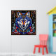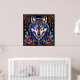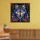 La tête de loup stylisée de façon frappante, caractérisée par des motifs complexes et des couleurs vives. La fourrure du loup est principalement un mélange de bleu et de blanc, avec des accents orange vif qui mettent en valeur le visage et les oreilles. Autour du cou, une chaîne décorative apporte une touche de décoration. L'arrière - plan est orné de différentes formes colorées, cristaux et feuilles, qui rehaussent l'aspect mystique et artistique général de la pièce. De plus, des éléments décoratifs tels que des perles et des ornements pendent des côtés, contribuant à une atmosphère bohème.