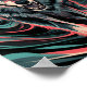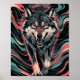 Le loup en mouvement - Portrait de fond d'un loup à l'expression féroce, sa bouche ouverte dans un serpent, Exposant des dents pointues. La fourrure du loup est un mélange de noir, gris et blanc, avec une couleur rougeâtre autour des yeux et museau. L'arrière - plan est un motif abstrait tourbillonnant de noir, turquoise et rouge, créant une atmosphère énergique et énergique. Les yeux du loup sont jaune vif, ajoutant à son intensité.