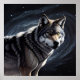 Un loup gris saisissant regarde avec confiance sous un ciel nocturne étendu et plein d'étoiles, exubérant puissance et sérénité. Le décor cosmique vient compléter sa beauté naturelle, symbolisant la nature sauvage, la force et l'harmonie avec la nature.