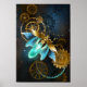 Luciole à vapeur avec ailes bleues transparentes et ampoule verte sur arrière - plan usé, marron, texturé. Style Steampunk.