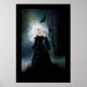 Femme aux cheveux blancs en robe victorienne noire. Deux corbeaux volent autour d'elle dans une forêt.