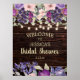 Bannière de bienvenue / enseigne de Shower de mariage avec un design en bois de grange rustique avec des guirlandes lumineuses et des fleurs aquarelles roses et violettes.