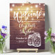 Modèles de pancarte de réception de mariage de bienvenue - Couple élégant Pots de maçon et lumières de corde sur fond de bois rustique.