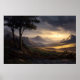 Un paysage majestueux où la lumière dorée traverse la vallée, dévoilant la beauté silencieuse des montagnes et le mystère du ciel orageux. Cette oeuvre invitation une profonde contemplation, mêlant force et sérénité dans un équilibre visuel saisissant.