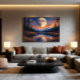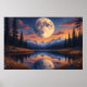 Une lune géante domine le ciel nocturne, illuminant les montagnes enneigées et réfléchissant sur un lac calme. De grands arbres encadrent les rives, tandis que des nuages oranges et bleus peignent l'horizon. Les étoiles scintillent, créant une scène magique qui transmet la paix et l'émerveillement. Parfait pour évoquer les rêves et les liens avec la nature sauvage, cette oeuvre allie beauté céleste et tranquillité terrestre en un seul instant.