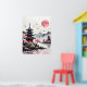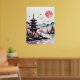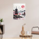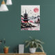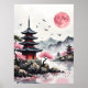 Ce tableau représente un paysage japonais spectaculaire sous une grande lune rose brillante. Une pagode à plusieurs niveaux se dresse sur une île rocheuse, avec une pagode plus petite visible au loin dans la brouillard. Des pétales de fleurs de cerisiers sont disséminés sur l'eau et le sol, ajoutant à l'atmosphère romantique. Un troupeau d'oiseaux noirs traverse le ciel illuminé par la lune, créant un sentiment de mouvement et de profondeur.