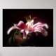 Photo de près d'un lys stargazer rose et blanc moucheté sur un arrière - plan noir. Une grande fleur baigne dans la lumière du soleil, tandis qu'une autre fleur se cache dans l'ombre au-delà comme un écho ou un reflet.