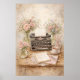 Une illustration douce de style vintage représentant une machine à écrire classique entourée de délicats bouquets de fleurs roses et pastel dans des bocaux en verre. Un mot manuscrit repose dans la machine à écrire, accompagné de cahiers, de crayons et d'une tasse de thé, créant une scène d'écriture calme et nostalgique avec une esthétique shabby chic.