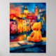 Warm Madrid teddy sunset artwork featuring a contemplative teddy bear silhouette overlooking Palacio Real and Almudena Cathedral at golden hour. Bold fauvist colors and structured geometric planes create vibrant wall art perfect for madrid lovers, nursery decor, and modern interiors.