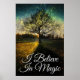 I believe in magic text. Digital composition of many personal photographs creating a magical dreamy scenery of fireflies around tree with shining light.