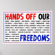 Lâche nos libertés ! Soyez prêt pour le prochain rassemblement de protestation #50501 à l'échelle nationale, un événement local de plaidoyer, ou portez/postez fièrement ce dessin à tout moment pour défendre ce qui compte. Le texte dit : MAINS OFFRE NOS corps, écoles publiques, procédure régulière, Sécurité sociale, soins de santé, Poste, droits LGBTQ+, alliés, climat, immigration, livres, bibliothèques et musées, traités et accords commerciaux, terres publiques, médias, droits de vote, neutralité du net, sports, anciens combattants, science, économie, vaccins, langues, recherche, citoyenneté, limites de durée, DEI, confidentialité des données, Medicare & Medic Aide, liberté de religion, NASA, syndicats, accessibilité, mariages, liberté d'expression, parcs, service météo, histoire, Constitution, LIBERTÉS !