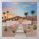 Illustration numérique originale de Noël Snow. La réinterprétation de cet artiste s'inspire du design architectural de William Krisel en partenariat avec la société de construction Alexander. Le soleil se couche derrière les montagnes d'un Palm Springs moderne du milieu du siècle "Alexander Home", affichant un magnifique ciel désertique multicolore. Des lumières rondes rétros à l'intérieur de la maison donnent une lueur subtile puisque les portes roses coralliennes accueillantes font face à une pelouse résistante à la sécheresse ornée de flamants roses du jardin.